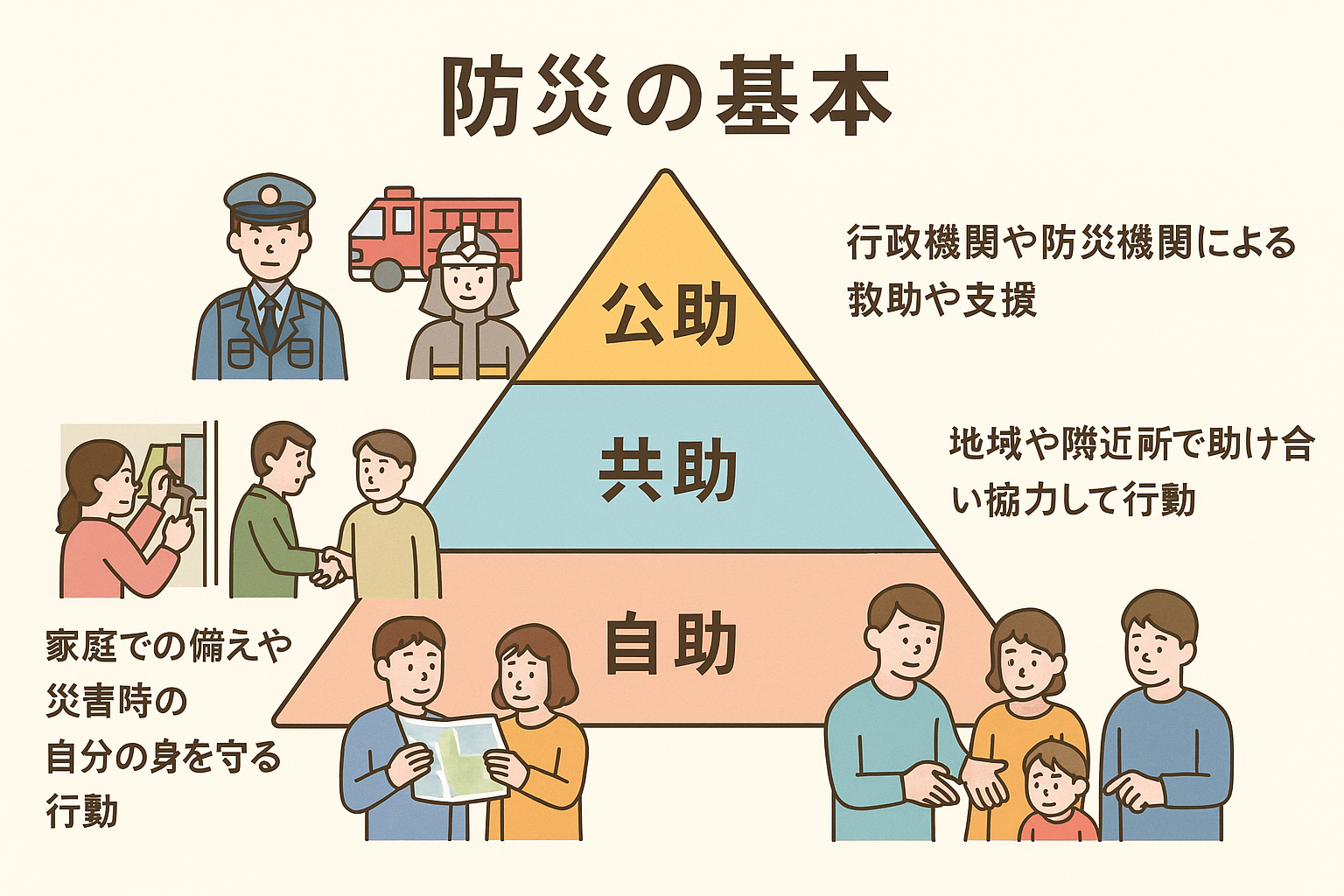 - 公助:行政や消防・警察などによる公的支援。
