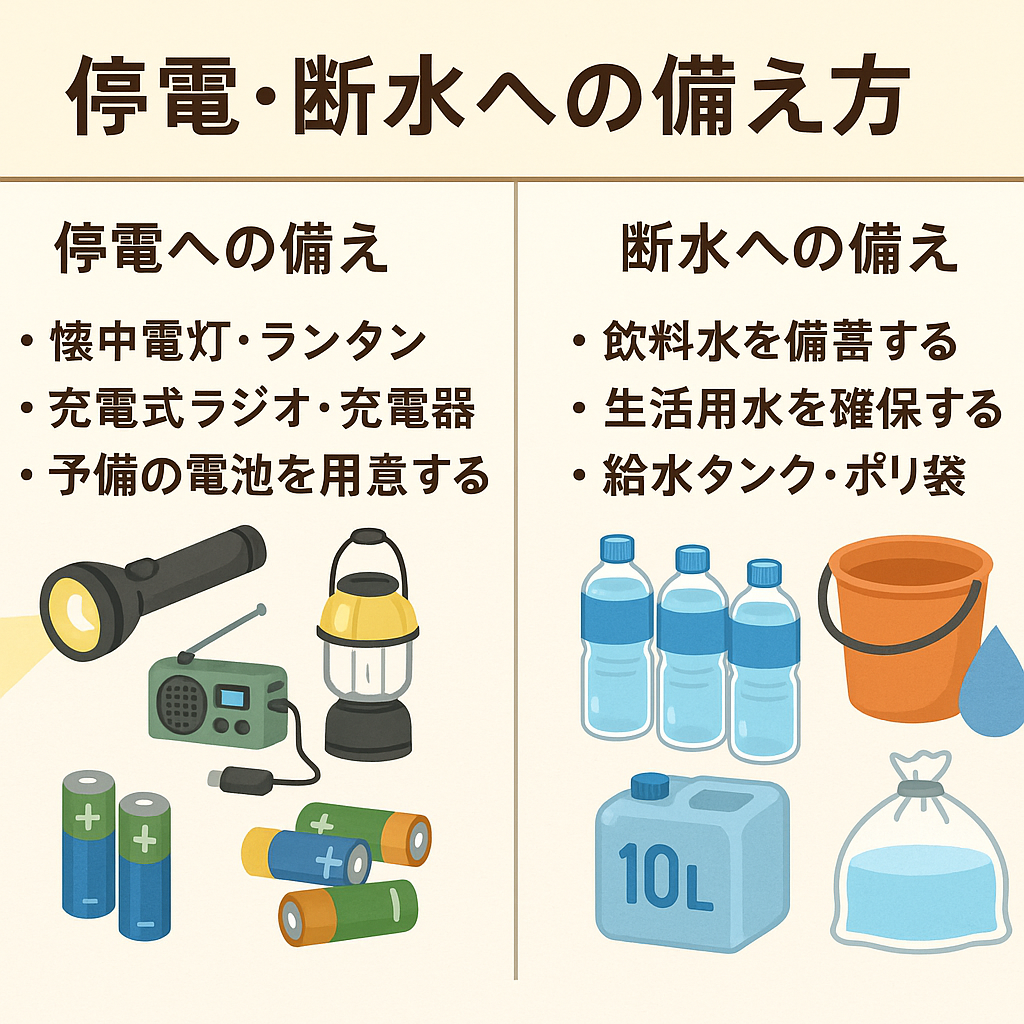 電気が止まれば照明も冷蔵庫も使えず、断水すれば飲み水・トイレ・調理にも困ります。