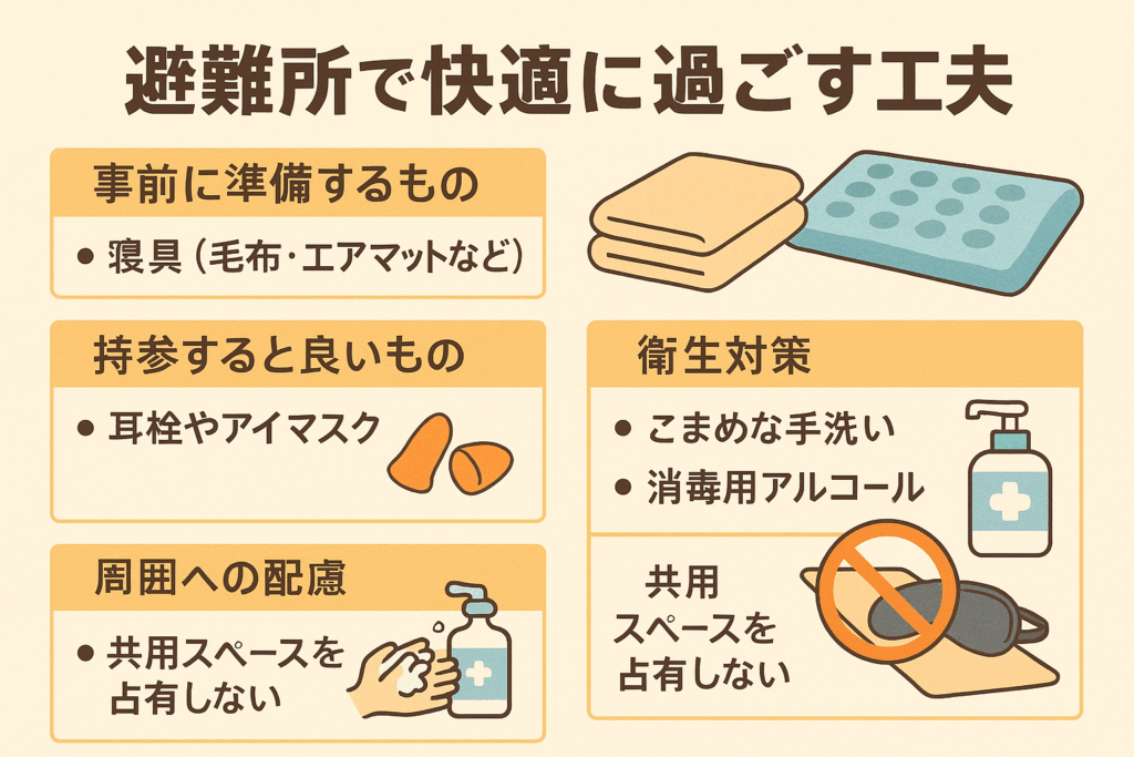 プライバシーを守る仕切り、衛生を保つ用品、睡眠の質を高めるアイテムを用意し、安心できる環境を自分で作る意識を持ちましょう。