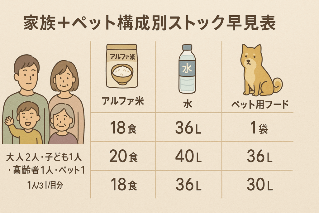 → 「家族+ペット構成別ストック早見表」で一覧化すると便利。